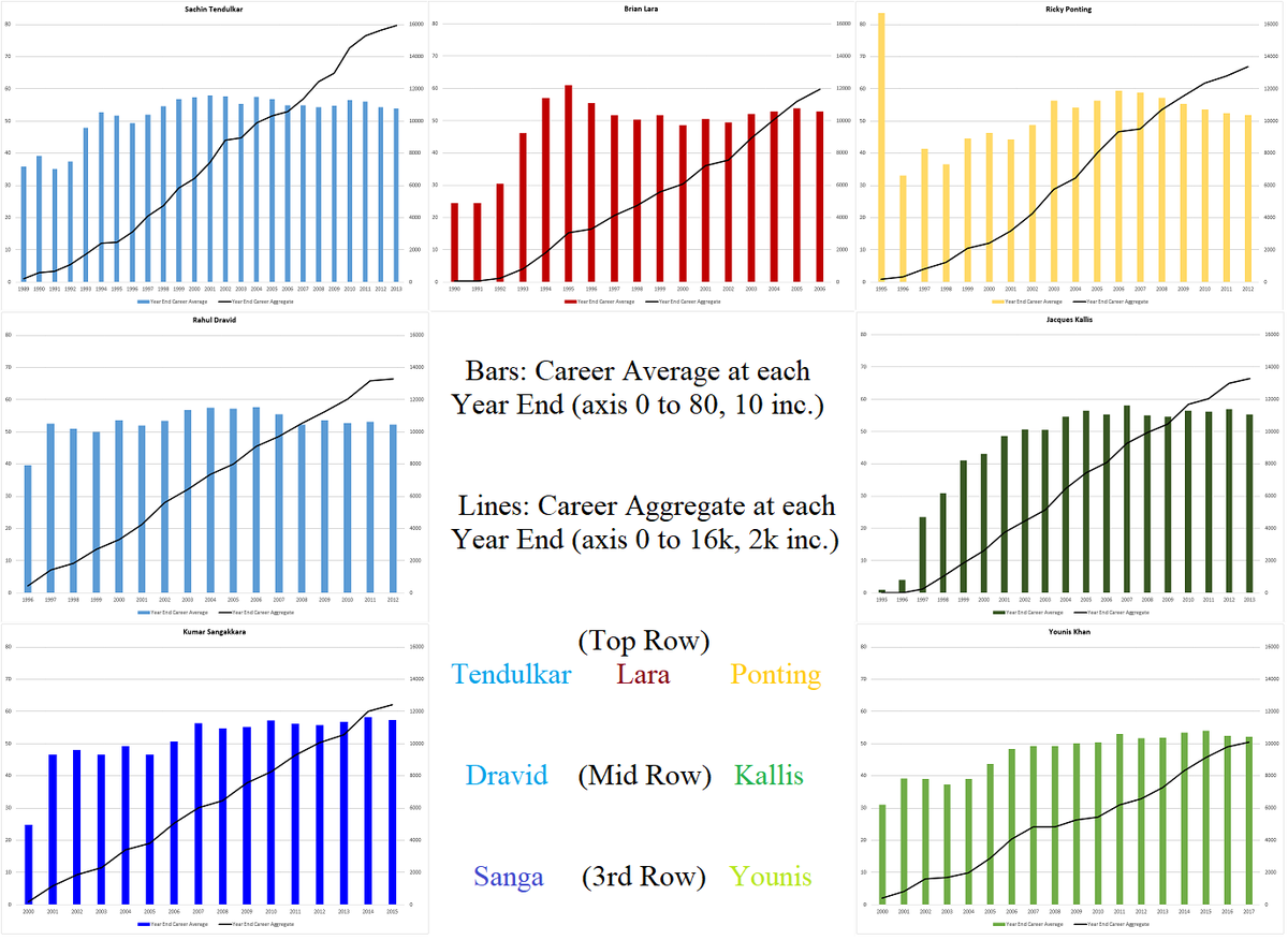 Kallis (after a slow start), Dravid, Sanga & YK kept their avgs reasonably steady through to the end. SRT was bound to have few ups & downs in 24 yrs. Lara had an unusual dip & Ponting had a textbook peak midway.