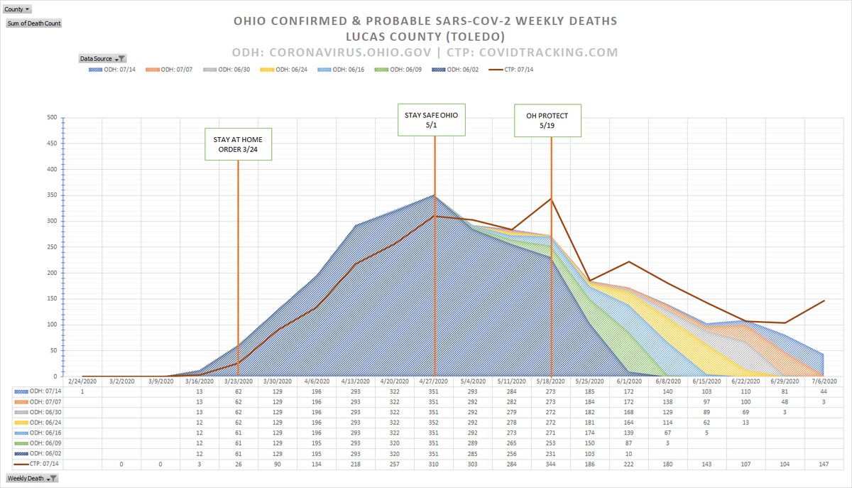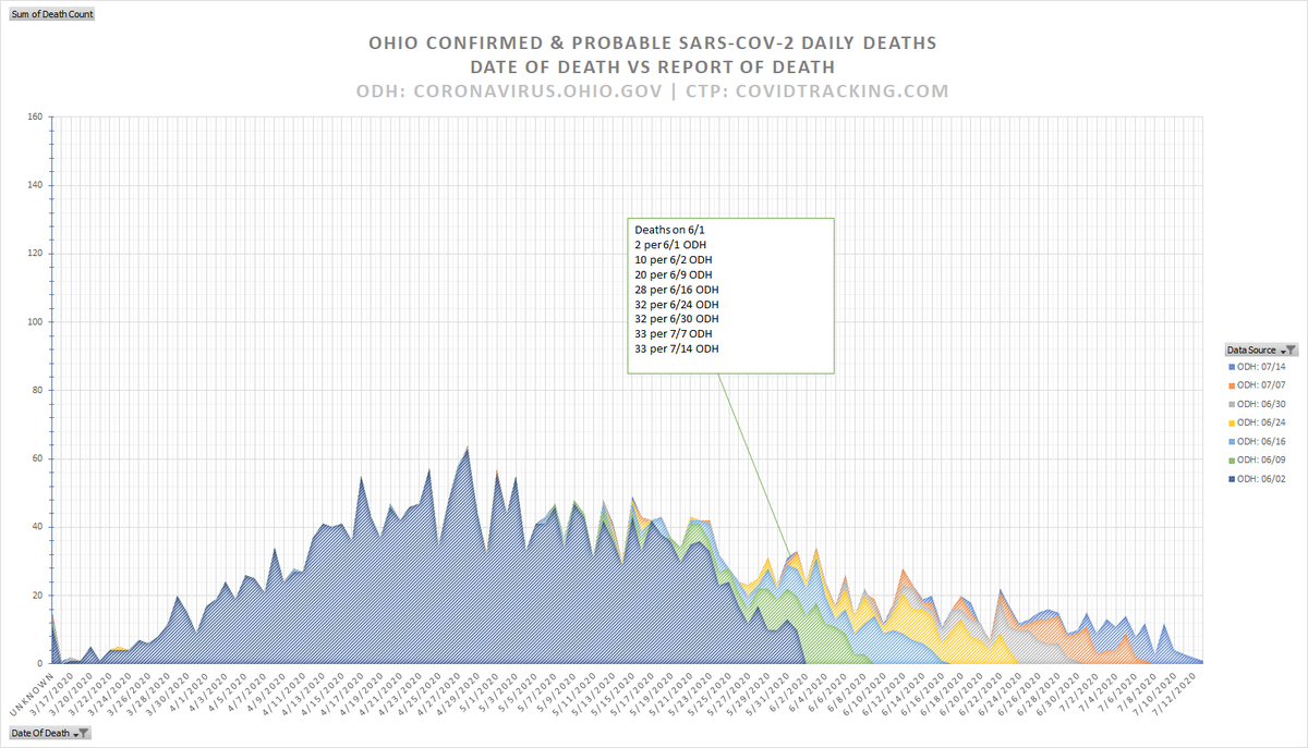 The Ohio Dept of Health (ODH) provides an excel file that lists dates by date of death. If you download the file from 6/1, you will get a chart that looks like this: