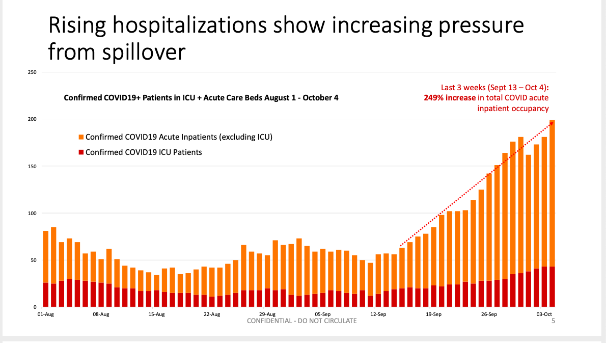 COVID-19 hospitalizations have risen 250% over the last 3 weeks (!!!!). FYI, the flatter ICU line is likely to lag behind regular hospitalizations because it takes a while to get sick enough to be admitted to the ICU.