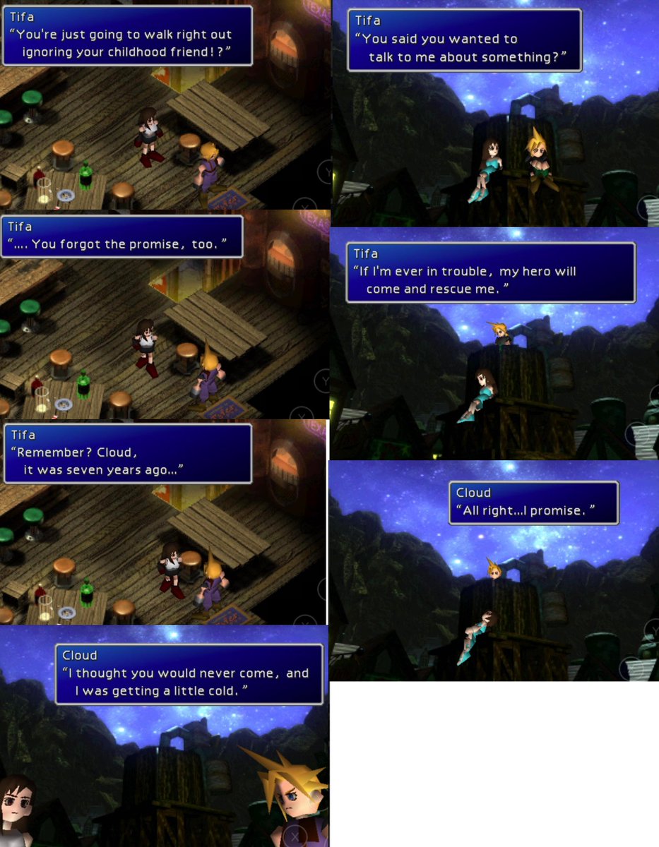 So I'm slowly replaying OG FF7 & I'll be adding to this thread of things I noticed that are different, mainly focusing on Cloti: First up, this new scene in FF7R where Jessie asks Cloud about his relationship with Tifa, his flashback of baby Tifa, & him about to answer