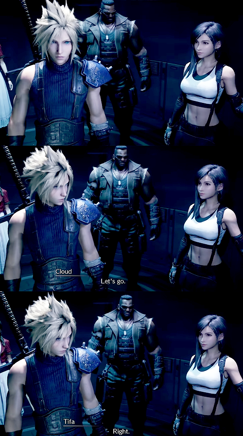 In FF7R, we get this new scene of Cloud & Barret bickering then Cloud & Tifa going off into their own world, discussing plans and Cloud f̶l̶i̶r̶t̶i̶n̶g̶ complimenting Tifa, with Barret third wheeling it